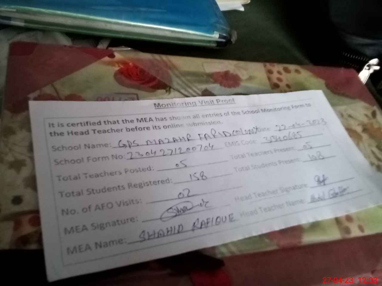 | EMIS Code: 31340685 | Name of School: GPS MAZHAR FARID COLONY | |||