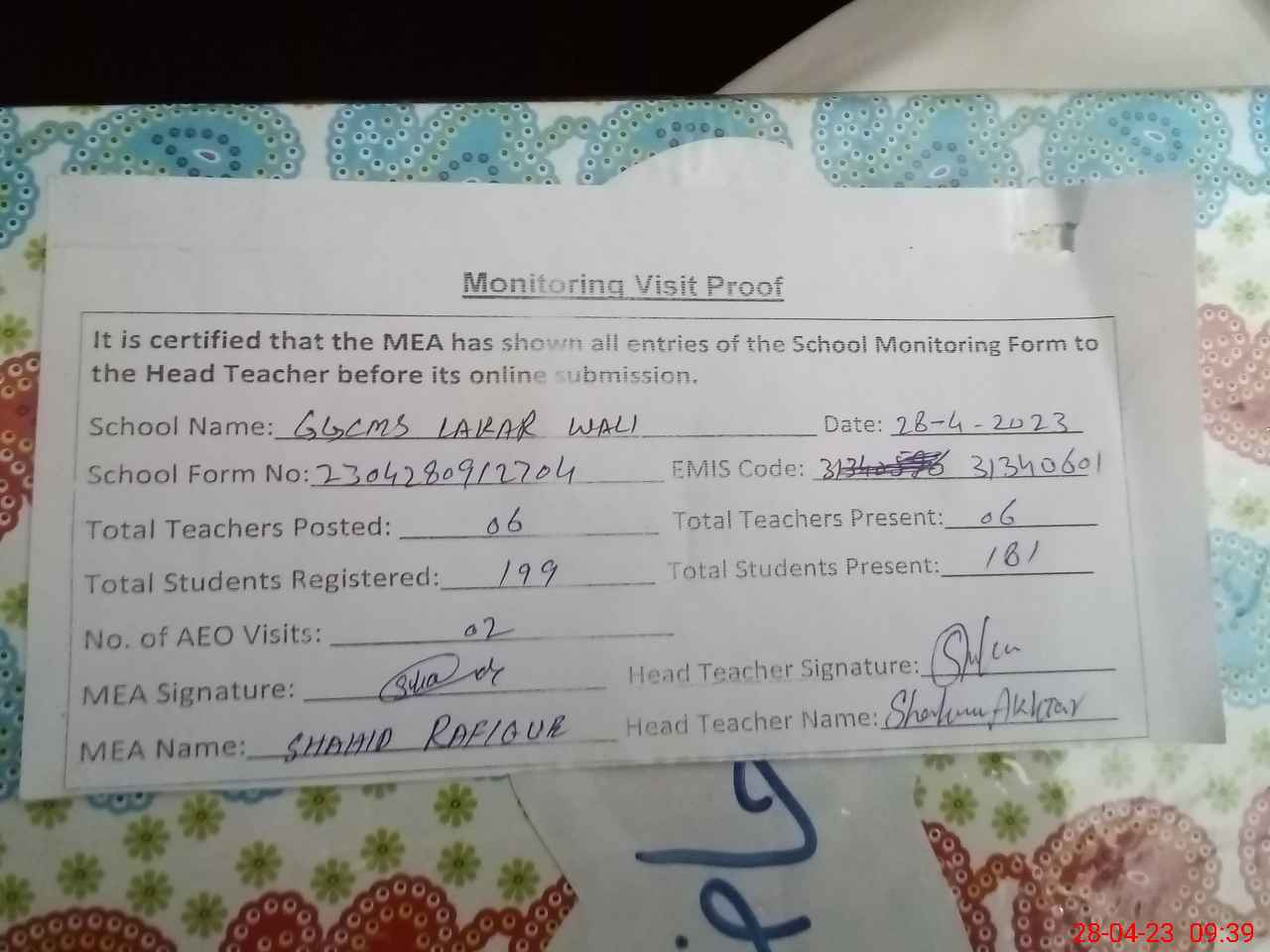 | EMIS Code: 31340601 | Name of School: GGCMS LAKAR WALI | |||