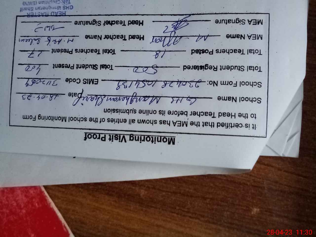 | Attendance Register | Head Teacher | MEA with School | Visit Proof |