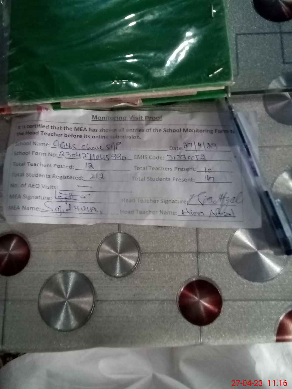 | Attendance Register | Head Teacher | MEA with School | Visit Proof |