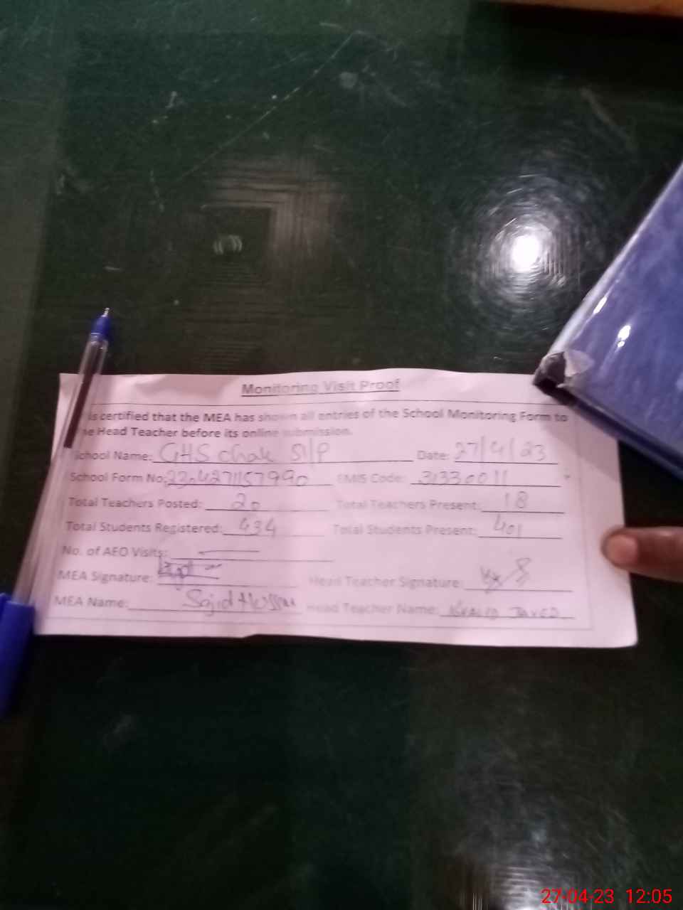 | Attendance Register | Head Teacher | MEA with School | Visit Proof |