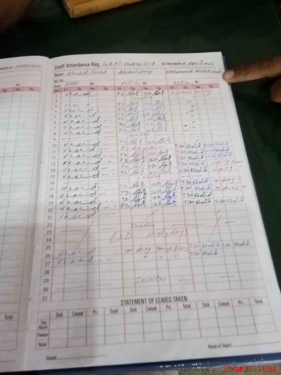 | CNIC | Full Name | Designation | R/C | Absence During Last Calender Month |