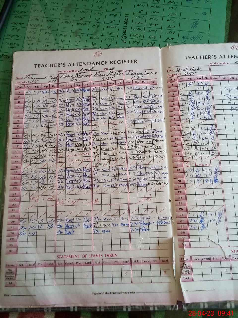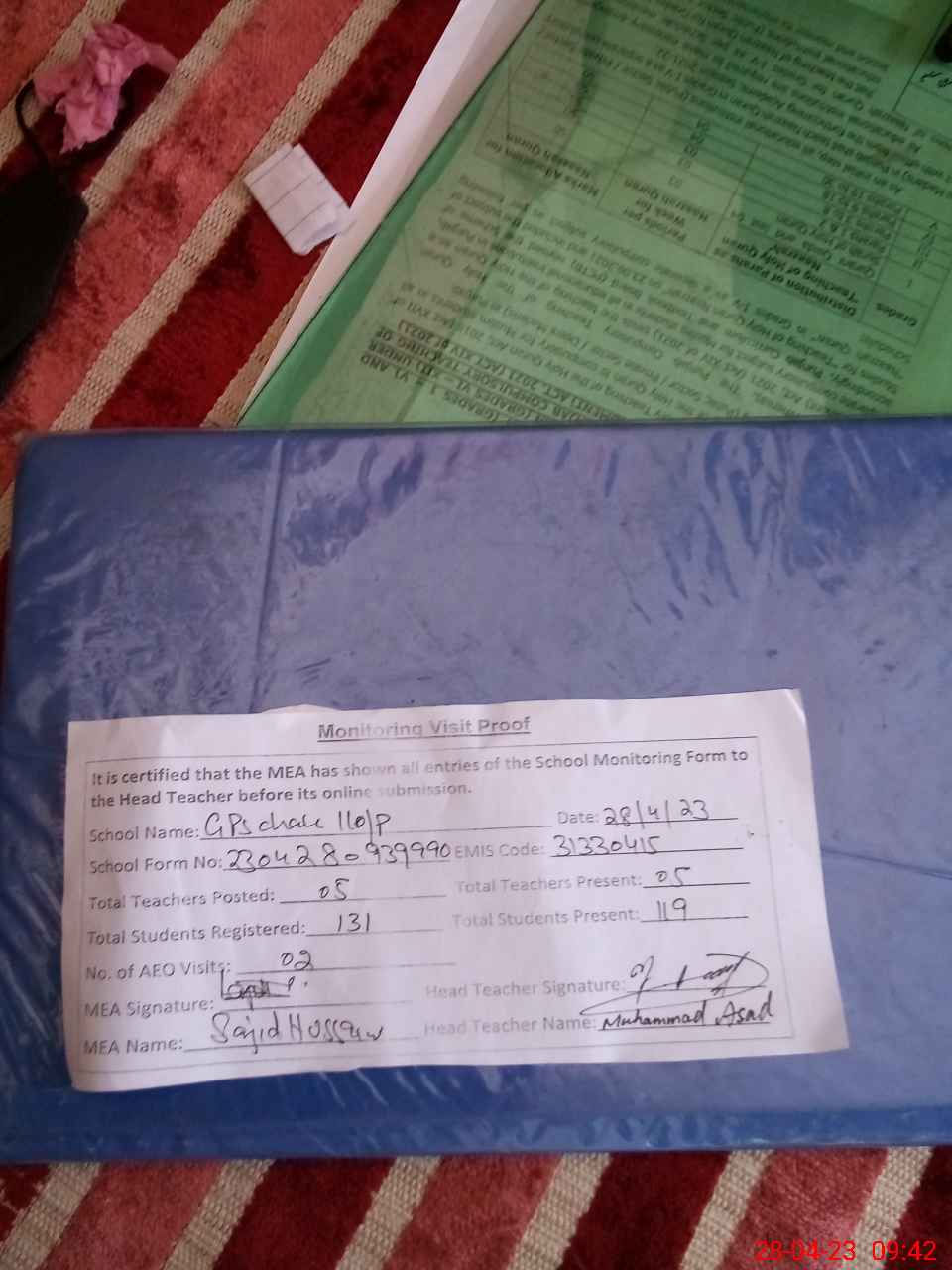 | Attendance Register | Head Teacher | MEA with School | Visit Proof |