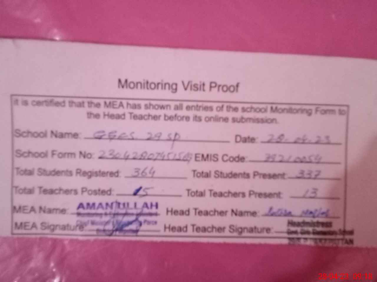 | Attendance Register | Head Teacher | MEA with School | Visit Proof |