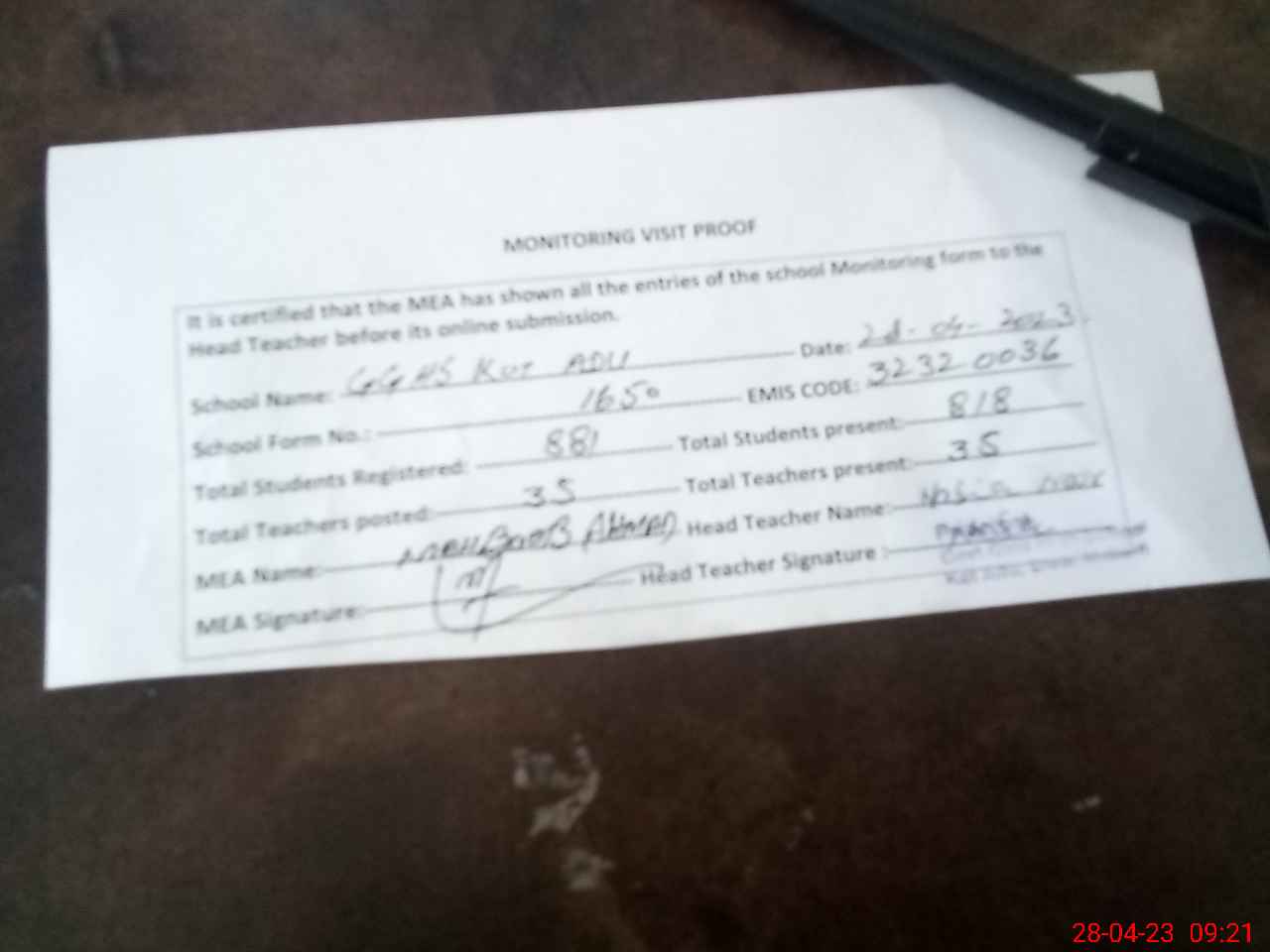 | EMIS Code: 32320036 | Name of School: GGHS KOT ADU | |||