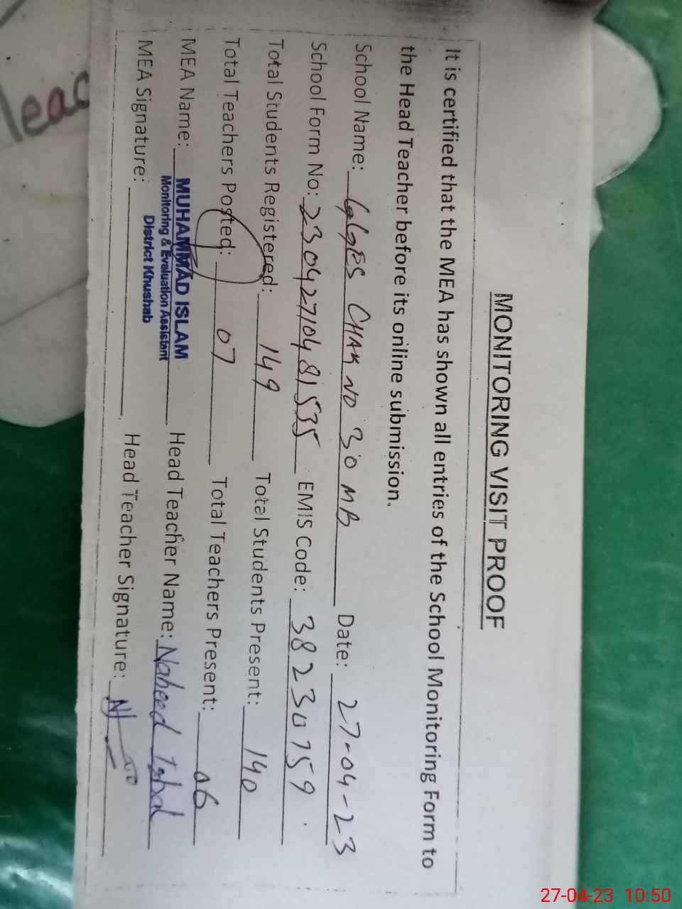 | Attendance Register | Head Teacher | MEA with School | Visit Proof |