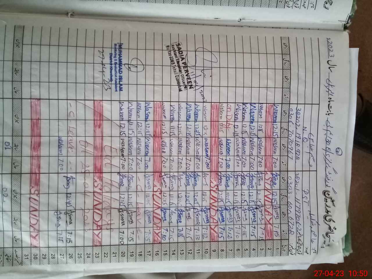 | CNIC | Full Name | Designation | R/C | Absence During Last Calender Month |