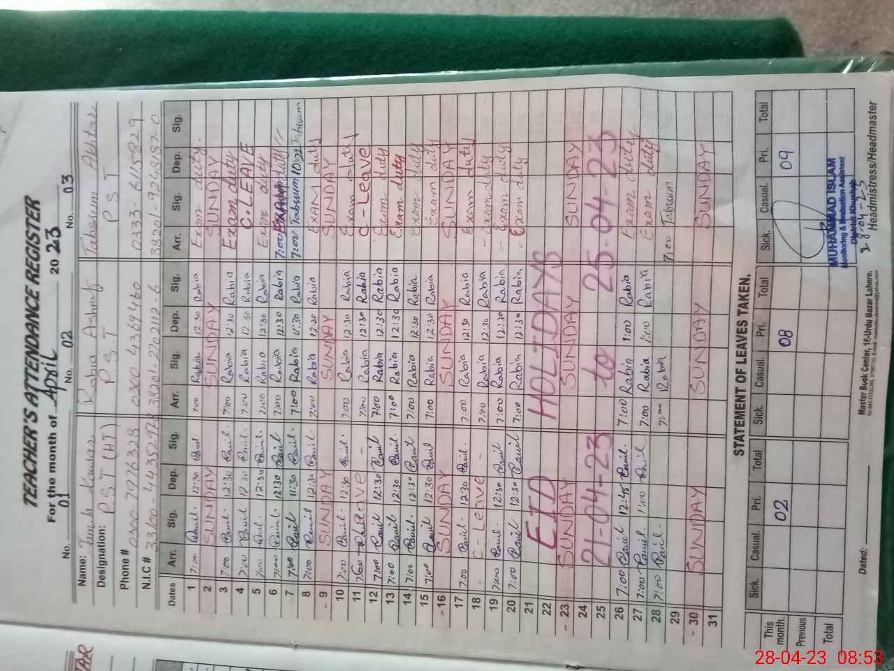 | CNIC | Full Name | Designation | R/C | Absence During Last Calender Month |