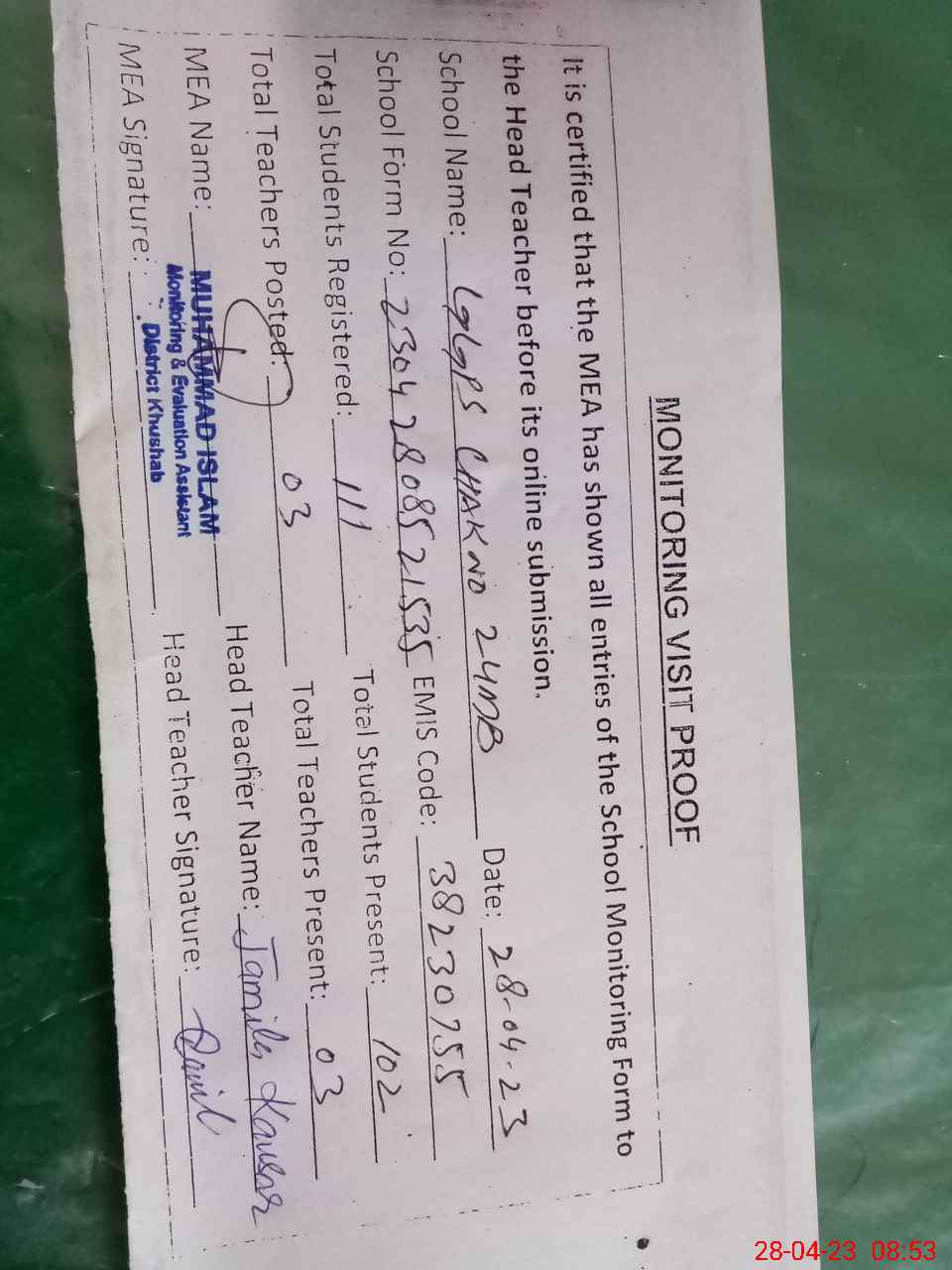 | Attendance Register | Head Teacher | MEA with School | Visit Proof |