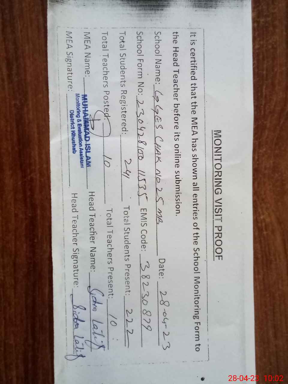| Attendance Register | Head Teacher | MEA with School | Visit Proof |