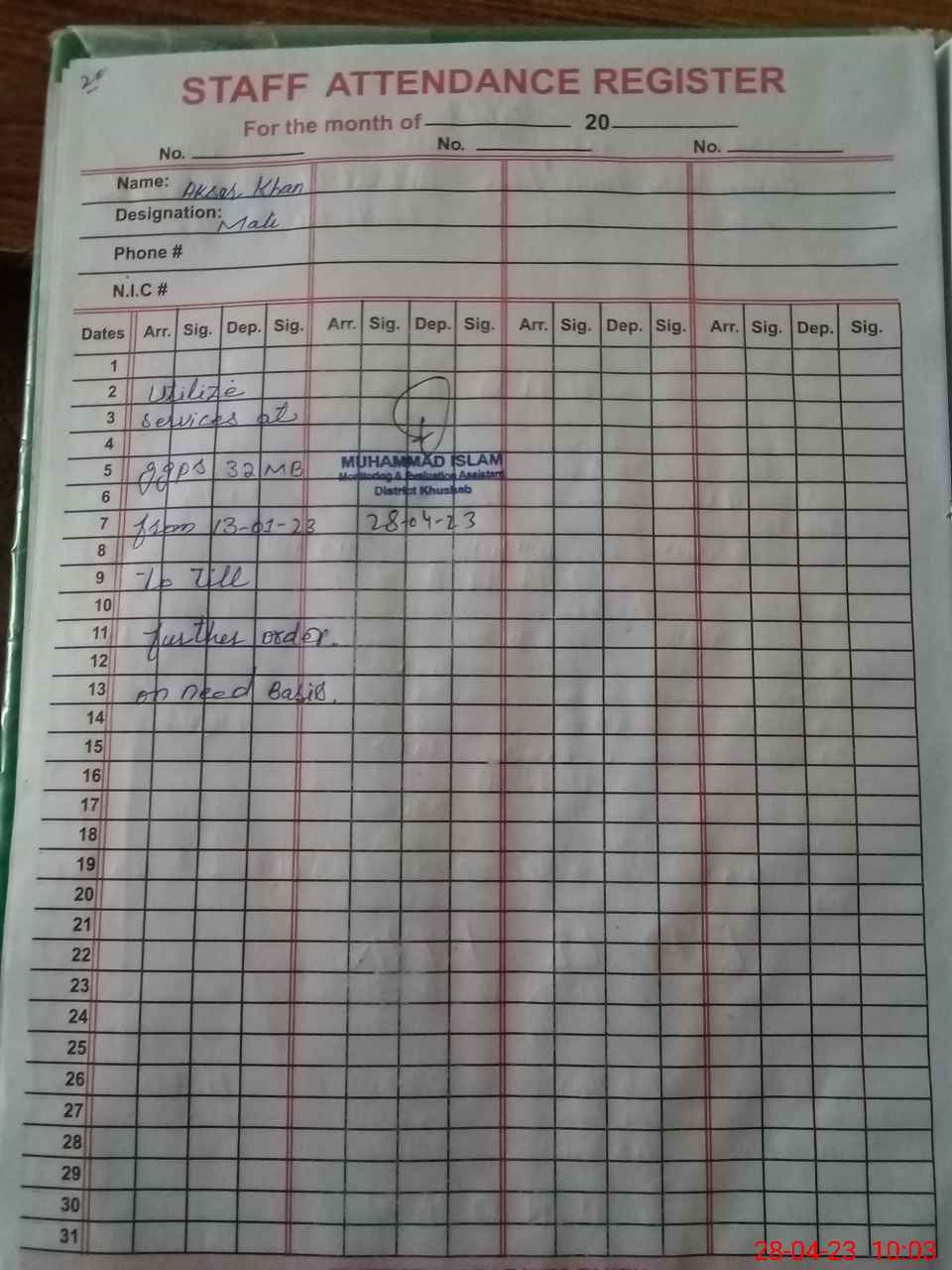 | CNIC | Full Name | Designation | R/C | Absence During Last Calender Month |
