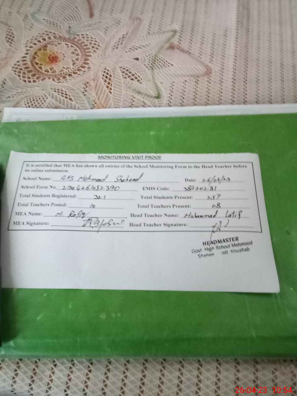 | EMIS Code: 38220231 | Name of School: GHS MAHMOOD SHAHEED | |||