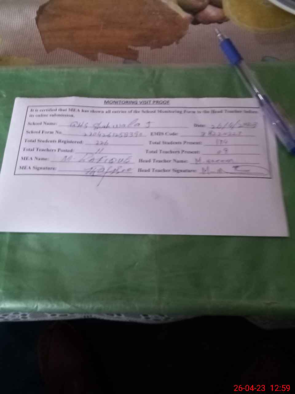 | Attendance Register | Head Teacher | MEA with School | Visit Proof |