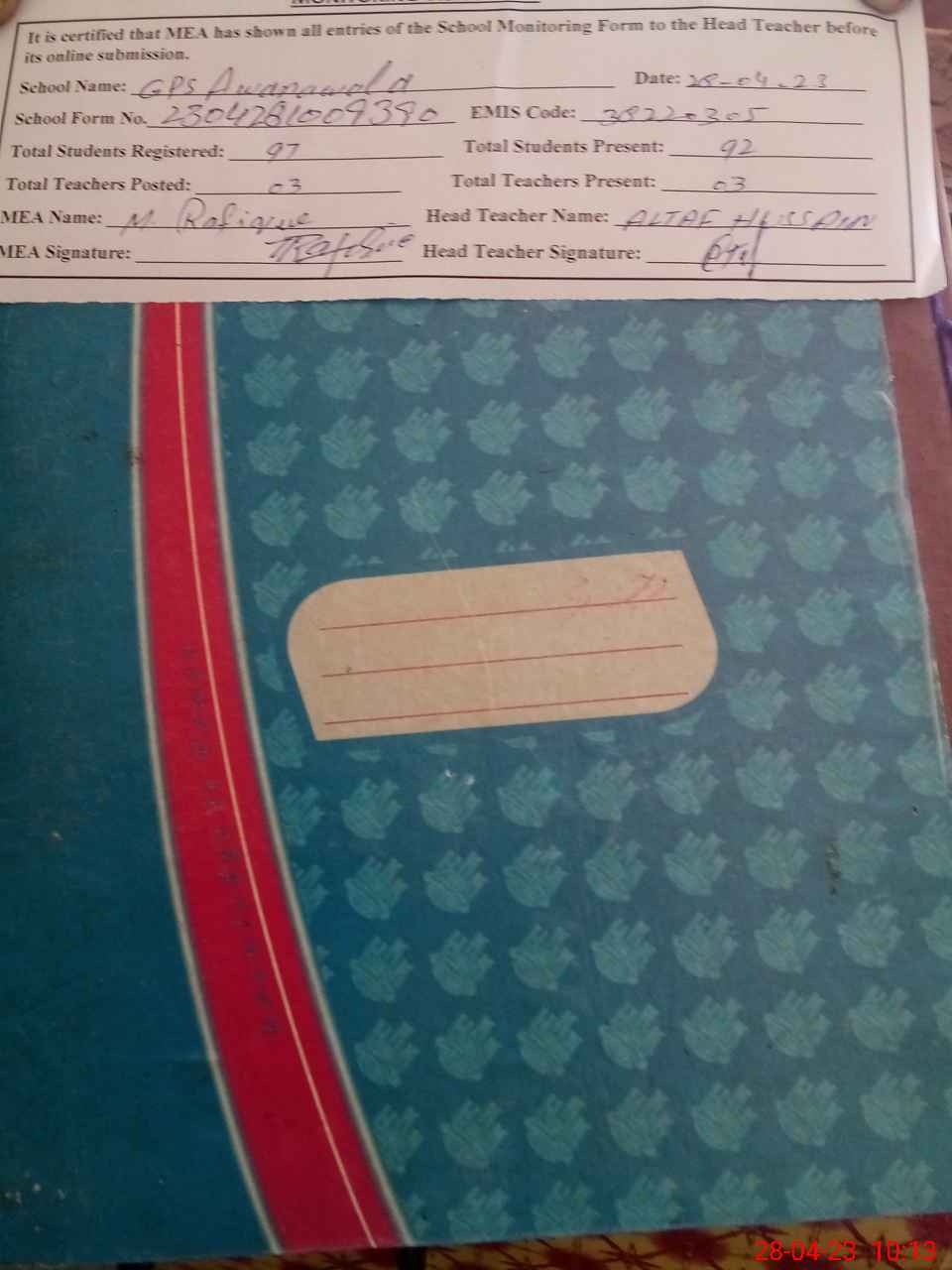 | Attendance Register | Head Teacher | MEA with School | Visit Proof |