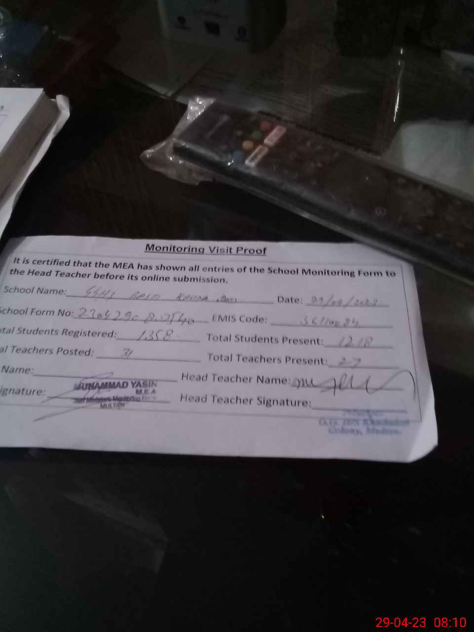 | Attendance Register | Head Teacher | MEA with School | Visit Proof |