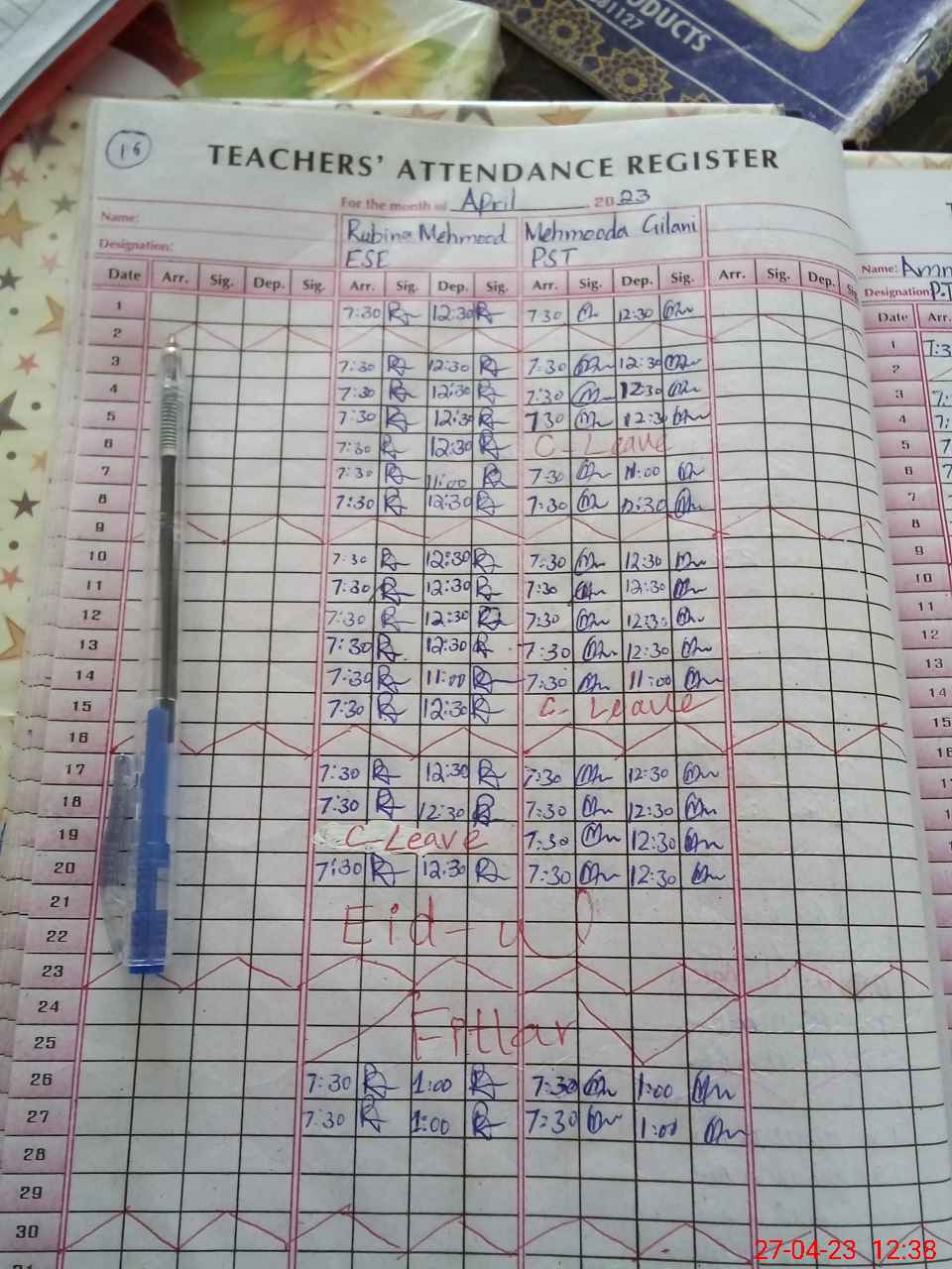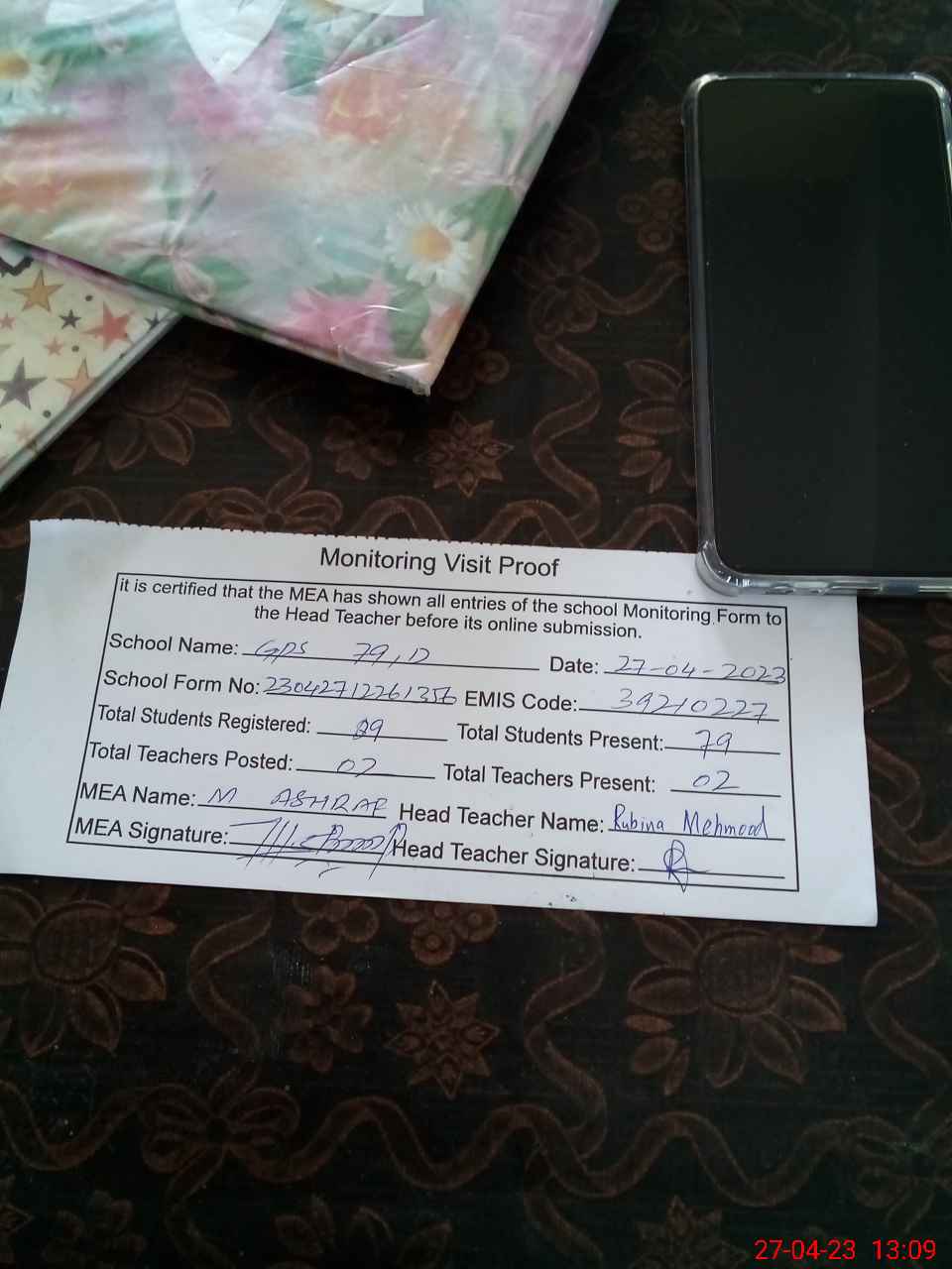 | Attendance Register | Head Teacher | MEA with School | Visit Proof |