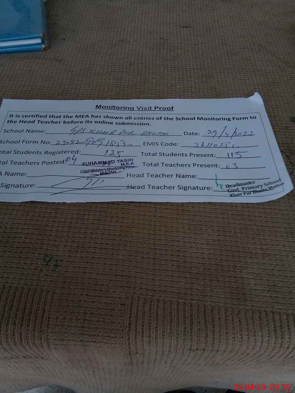 | EMIS Code: 36110152 | Name of School: GPS KHAIR PUR BHUTTA CANTT P/O QASIM BELLA | |||