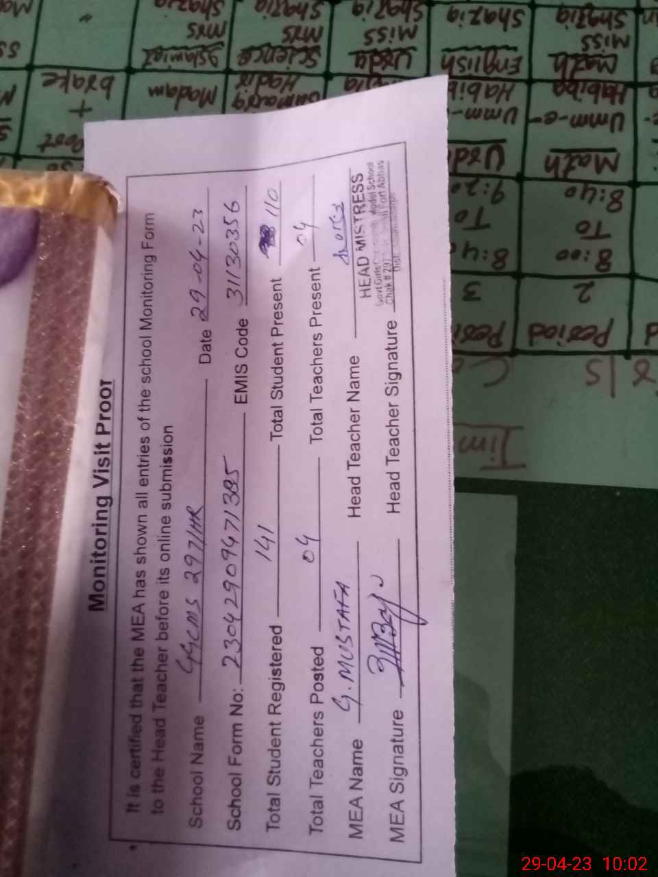 | Attendance Register | Head Teacher | MEA with School | Visit Proof |