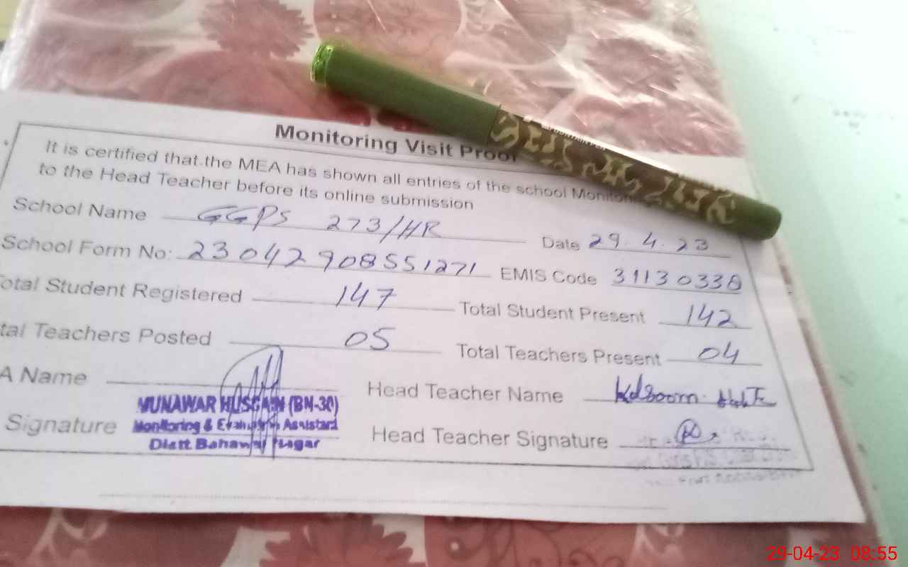 | EMIS Code: 31130338 | Name of School: GGPS CHAK NO 273 HR | |||