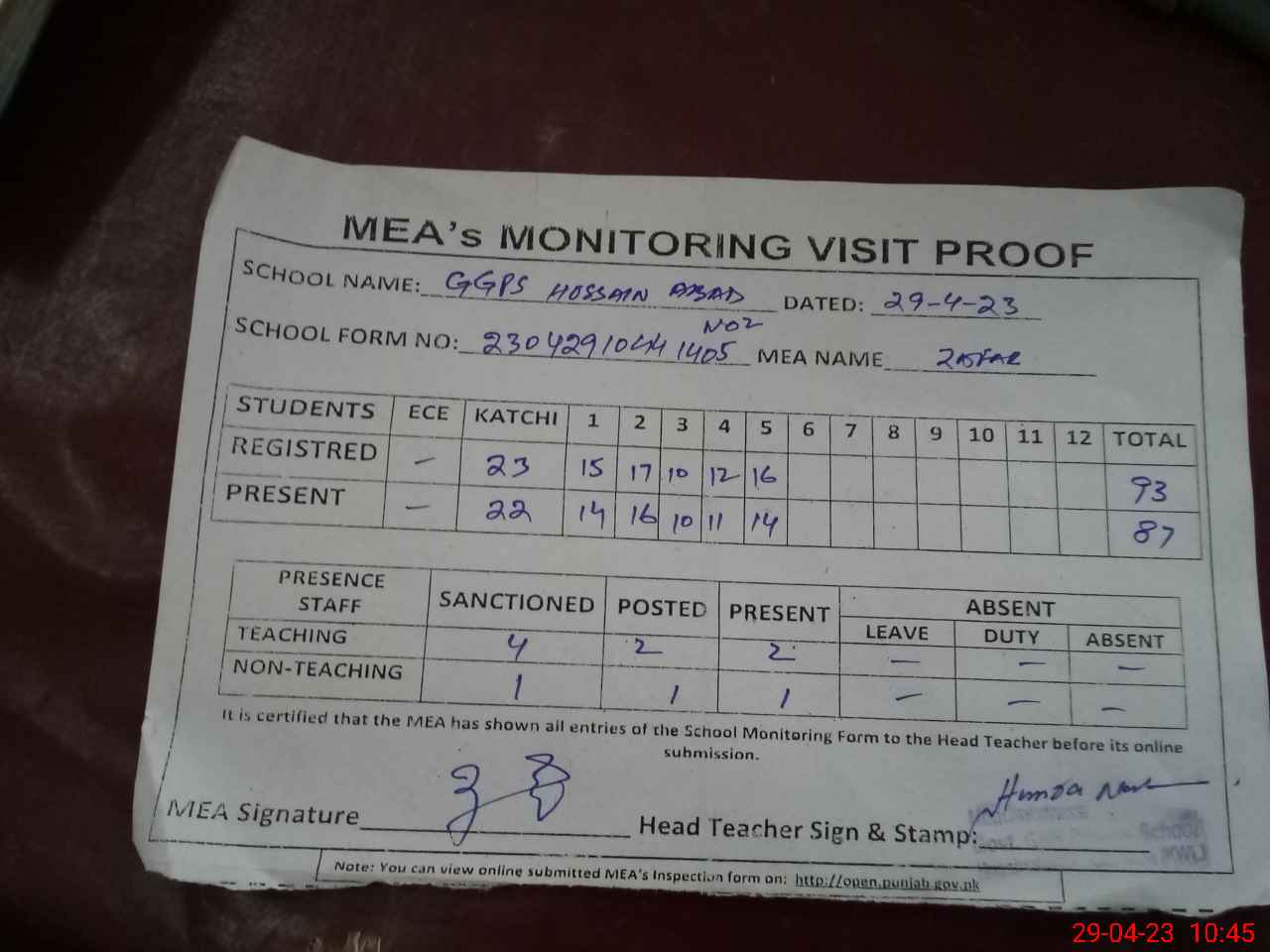 | Attendance Register | Head Teacher | MEA with School | Visit Proof |