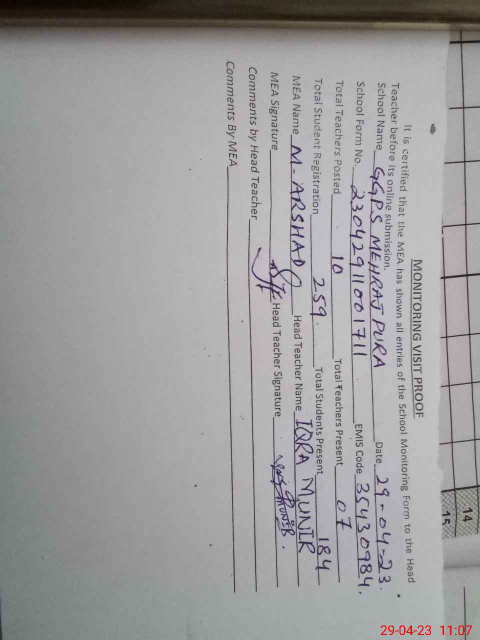 | EMIS Code: 35430984 | Name of School: GGPS MEHRAJ PURA | |||