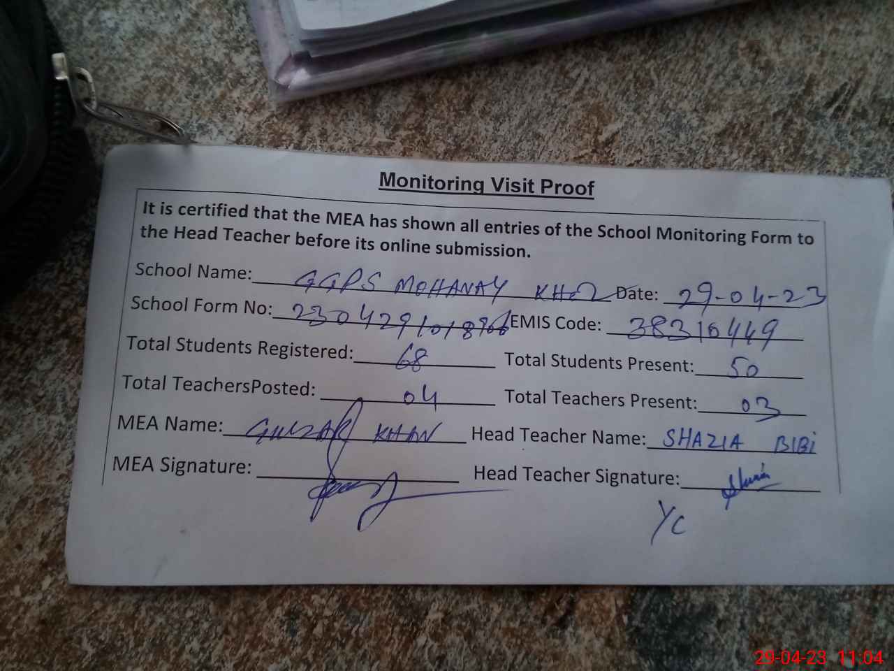 | Attendance Register | Head Teacher | MEA with School | Visit Proof |