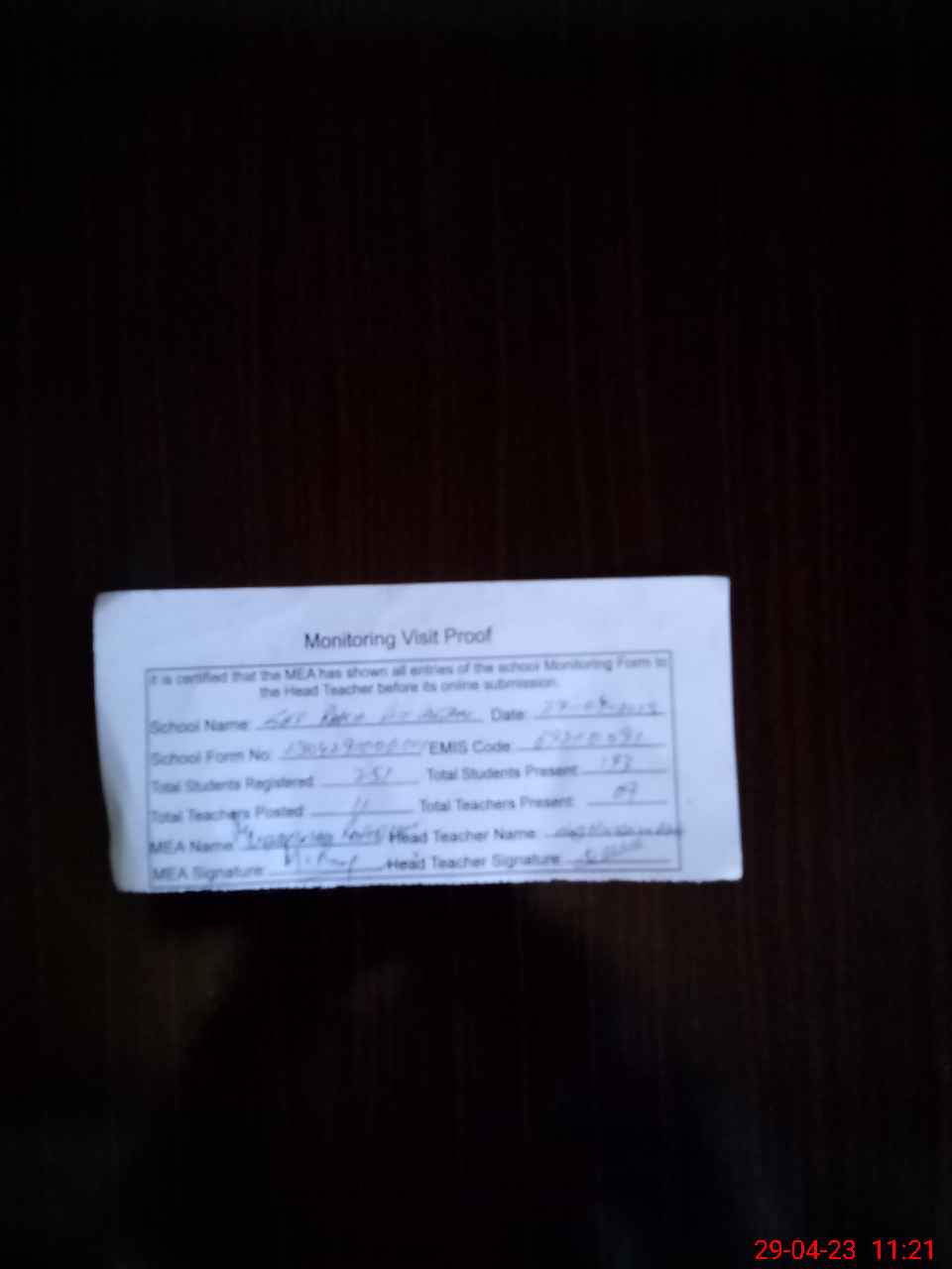 | Attendance Register | Head Teacher | MEA with School | Visit Proof |