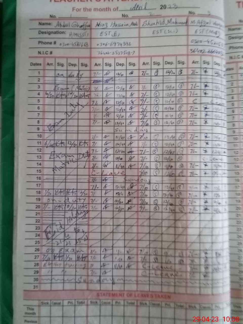 | CNIC | Full Name | Designation | R/C | Absence During Last Calender Month |
