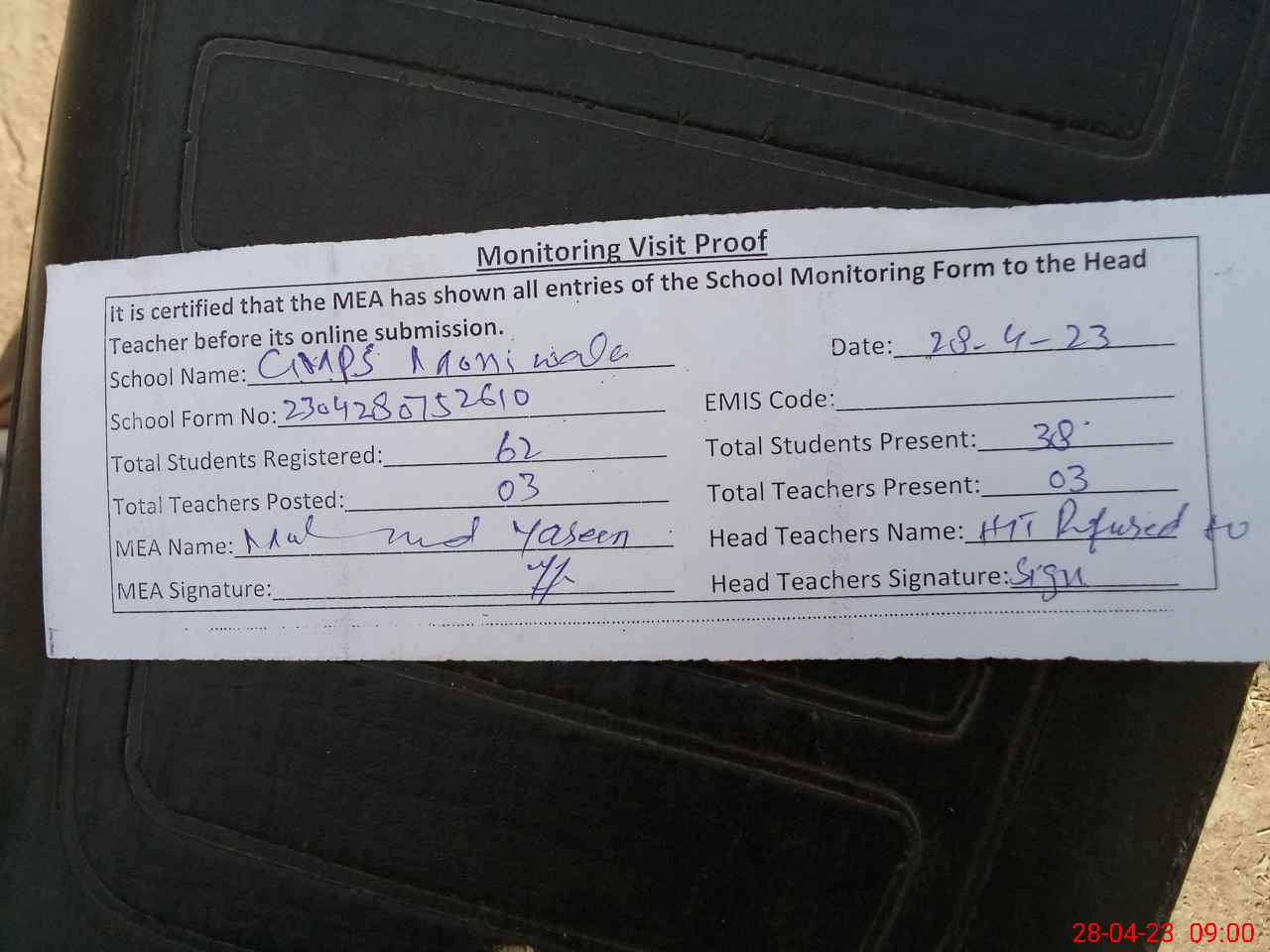 | Attendance Register | Head Teacher | MEA with School | Visit Proof |