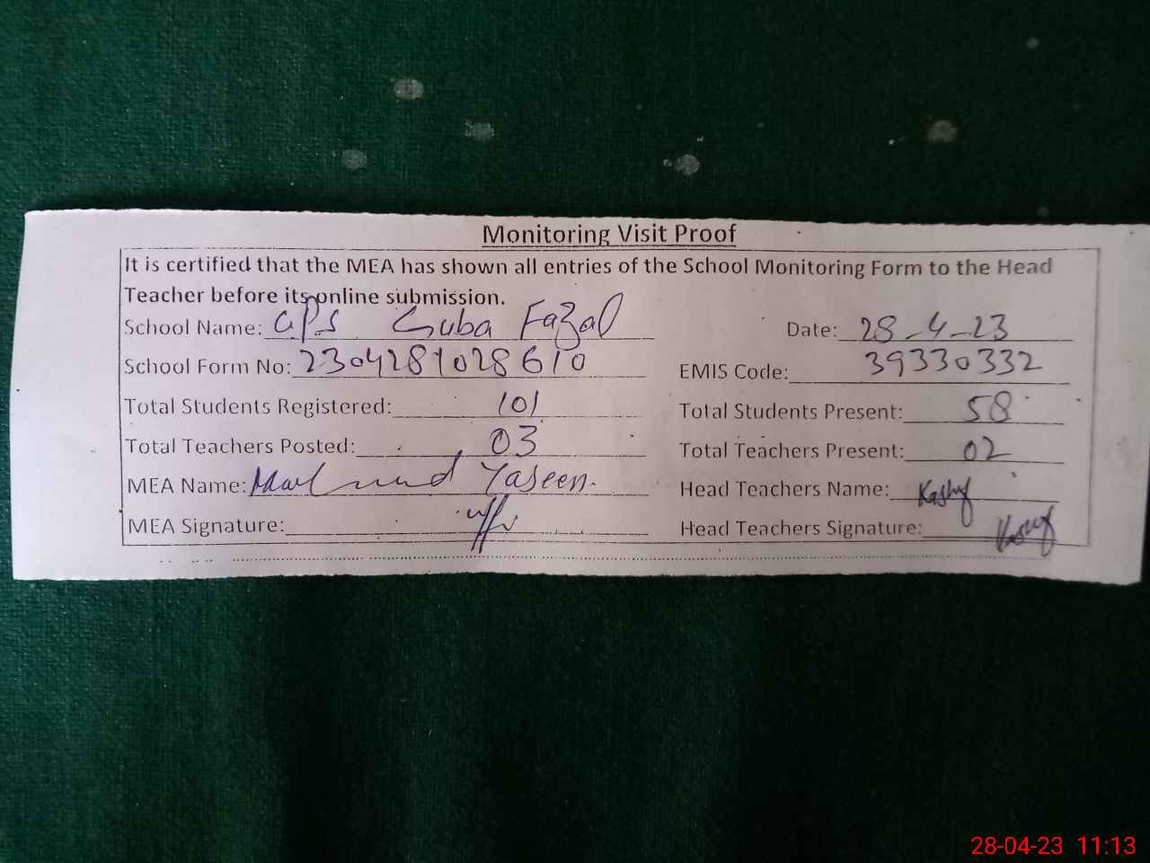 | EMIS Code: 39330332 | Name of School: GPS GUBBA FAZIL | |||
