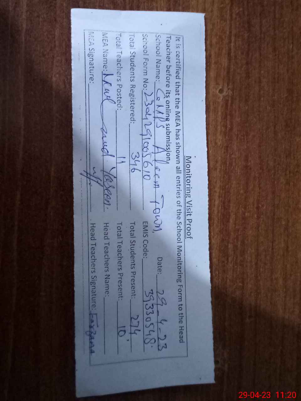 | Attendance Register | Head Teacher | MEA with School | Visit Proof |