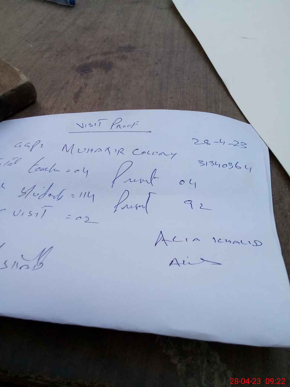 | Attendance Register | Head Teacher | MEA with School | Visit Proof |