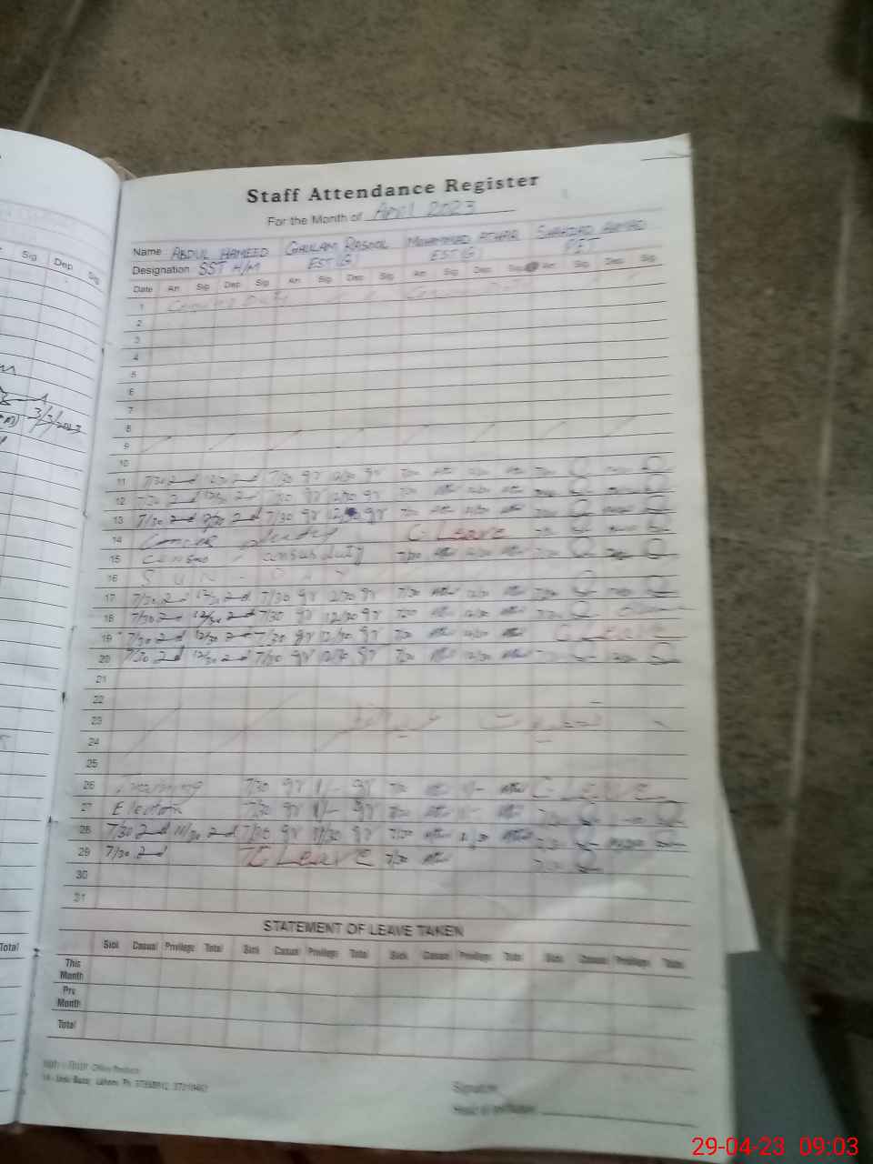 | Remarks (Use Separate Page if Required): The name of teacher Abdul Ghaffar is not in tab list but he is present | |||||