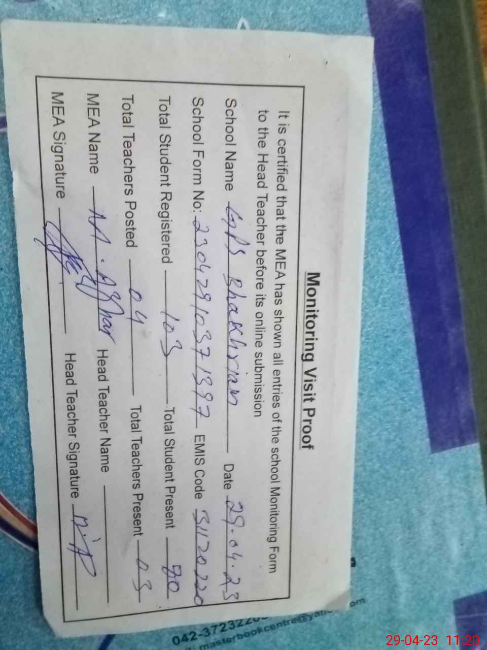 | Attendance Register | Head Teacher | MEA with School | Visit Proof |