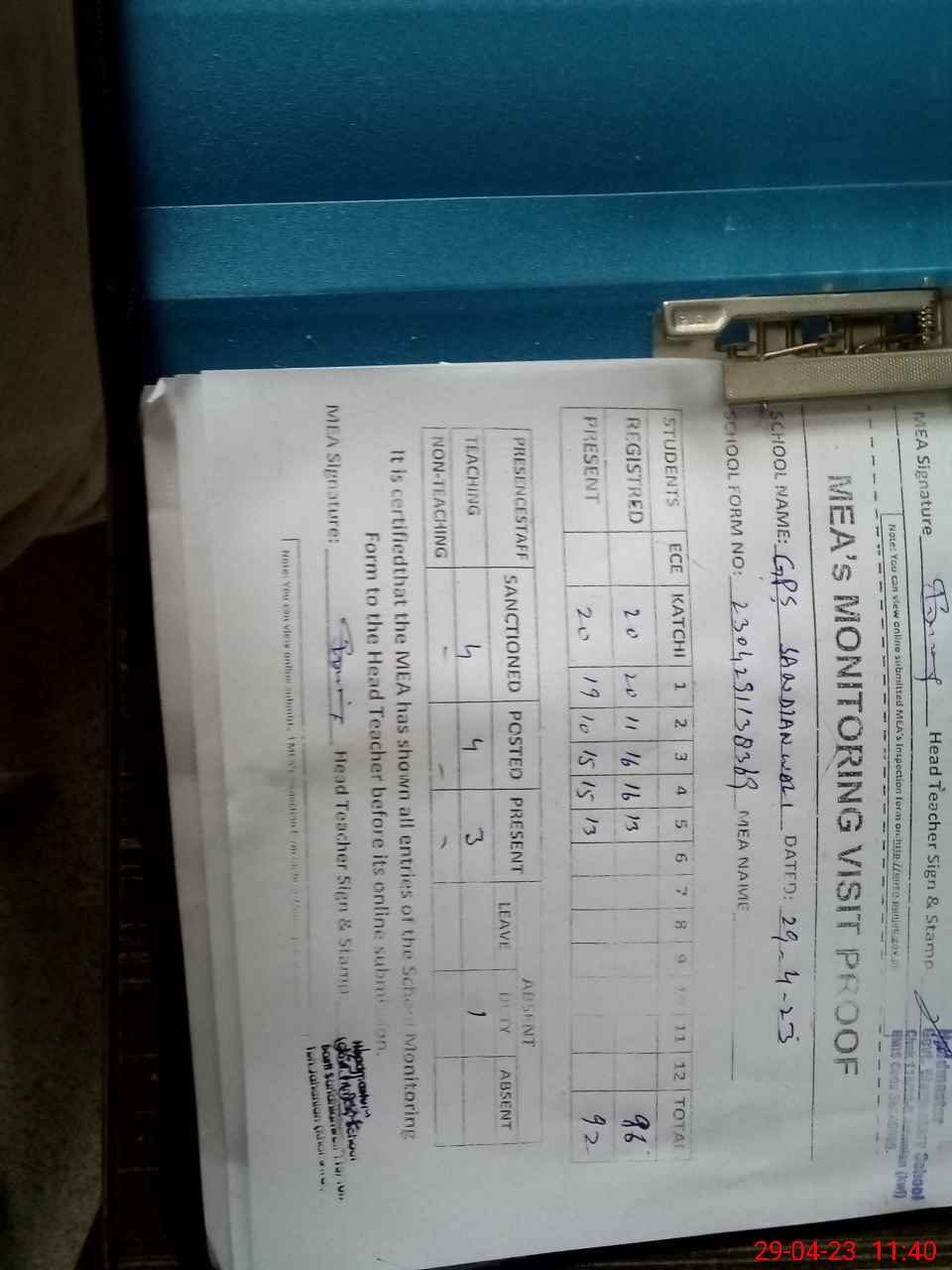 | Attendance Register | Head Teacher | MEA with School | Visit Proof |
