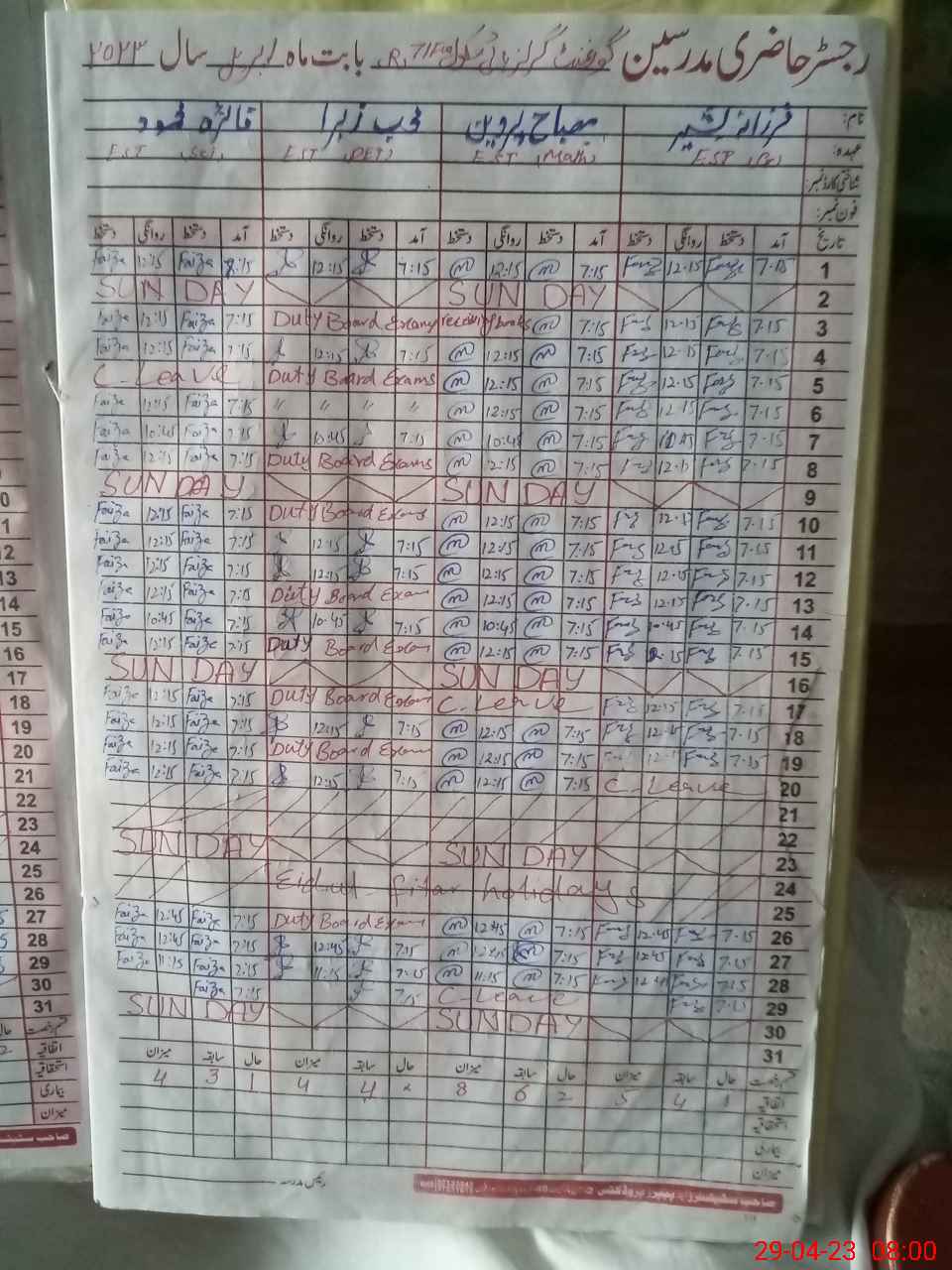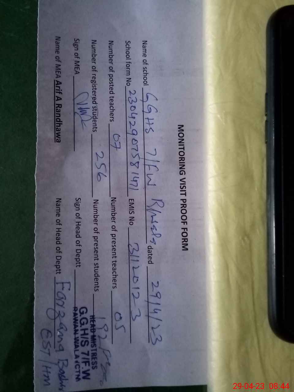 | EMIS Code: 31120123 | Name of School: GGHS CHAK 7/FW RANWAN WALA | |||