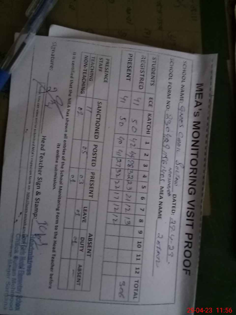 | Attendance Register | Head Teacher | MEA with School | Visit Proof |