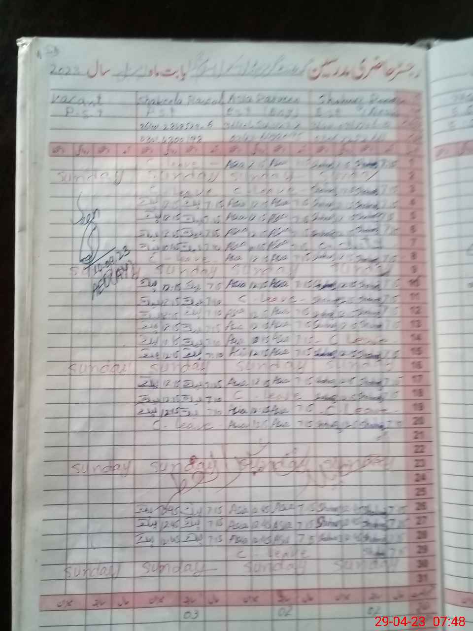 | CNIC | Full Name | Designation | R/C | Absence During Last Calender Month |
