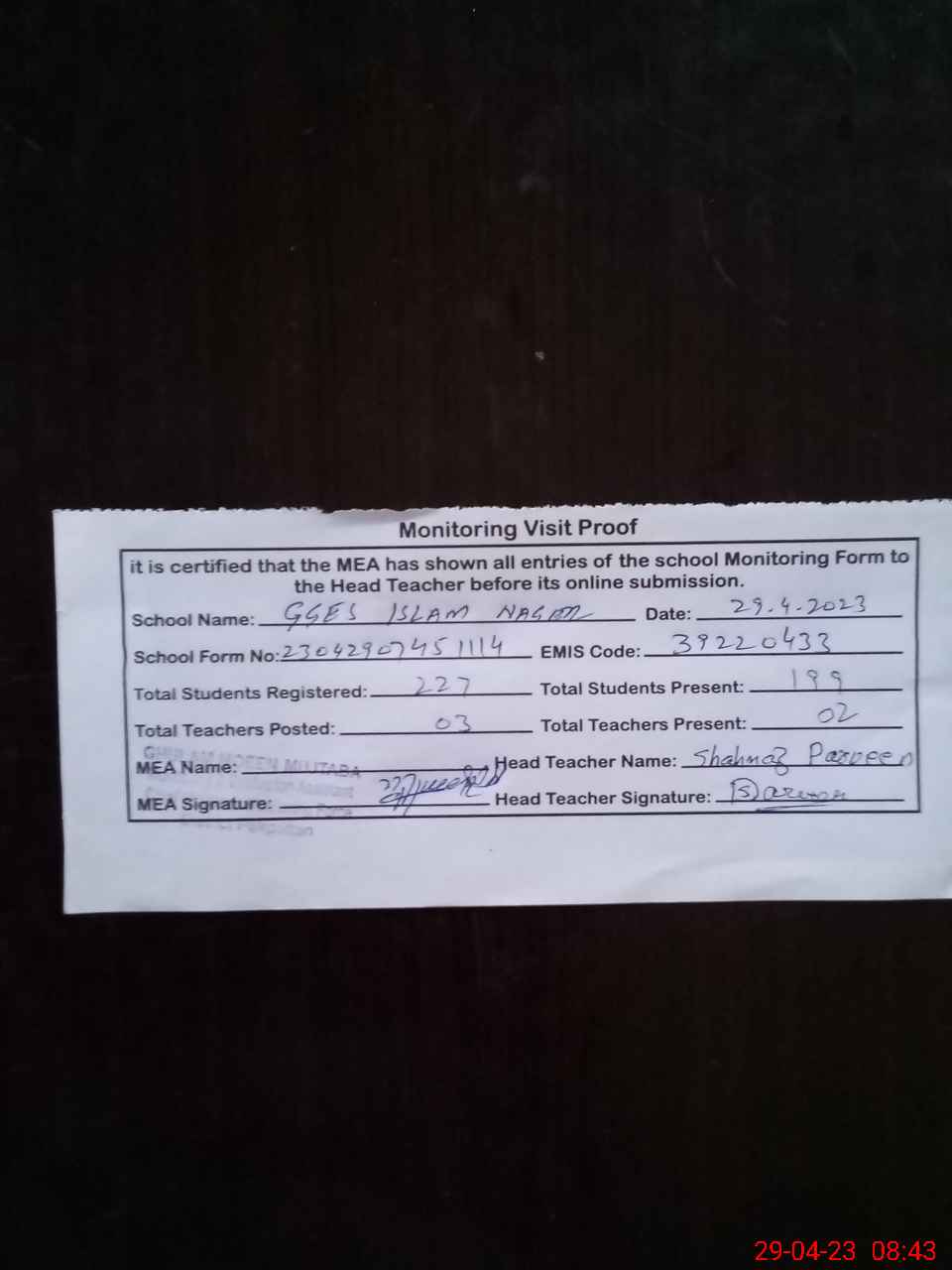 | Attendance Register | Head Teacher | MEA with School | Visit Proof |