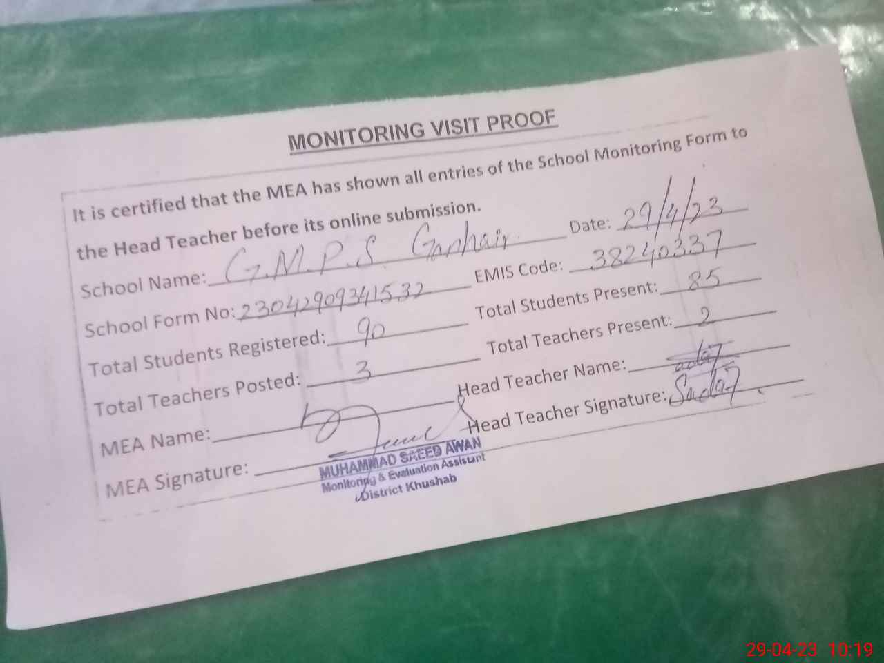 | Attendance Register | Head Teacher | MEA with School | Visit Proof |