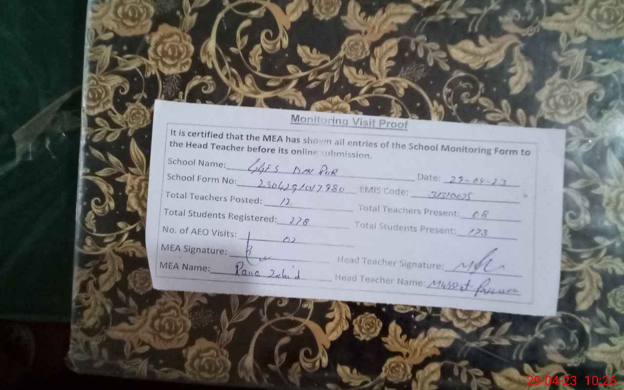 | Certified that this School was Inspected by the Undersigned MEA/DMO Today and the Information Stated Above is as Per Record. | |||||