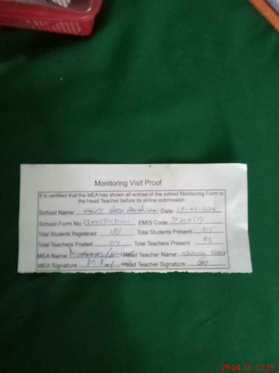 | Attendance Register | Head Teacher | MEA with School | Visit Proof |