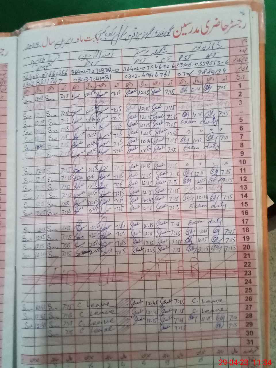 | CNIC | Full Name | Designation | R/C | Absence During Last Calender Month |