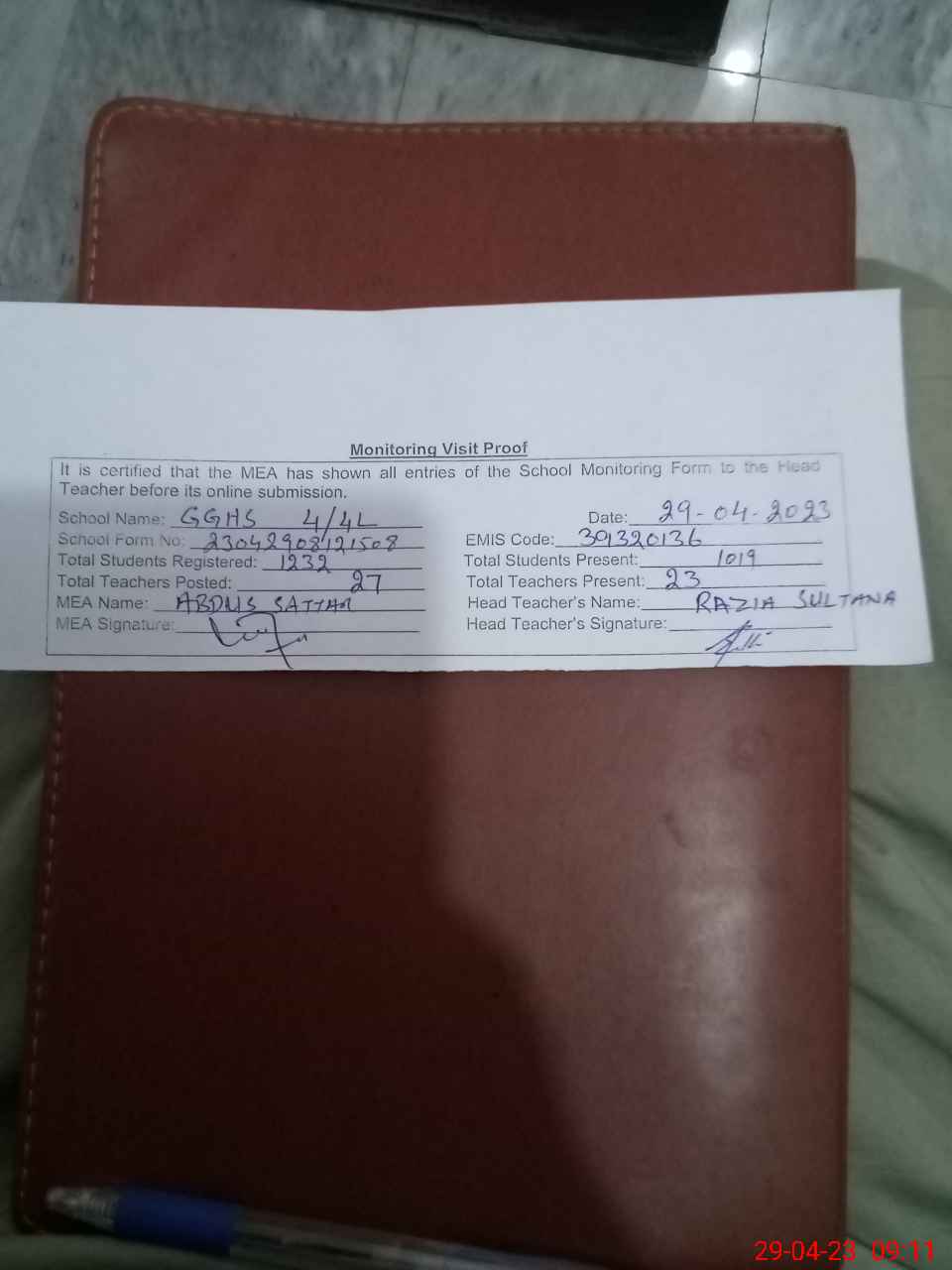 | Attendance Register | Head Teacher | MEA with School | Visit Proof |