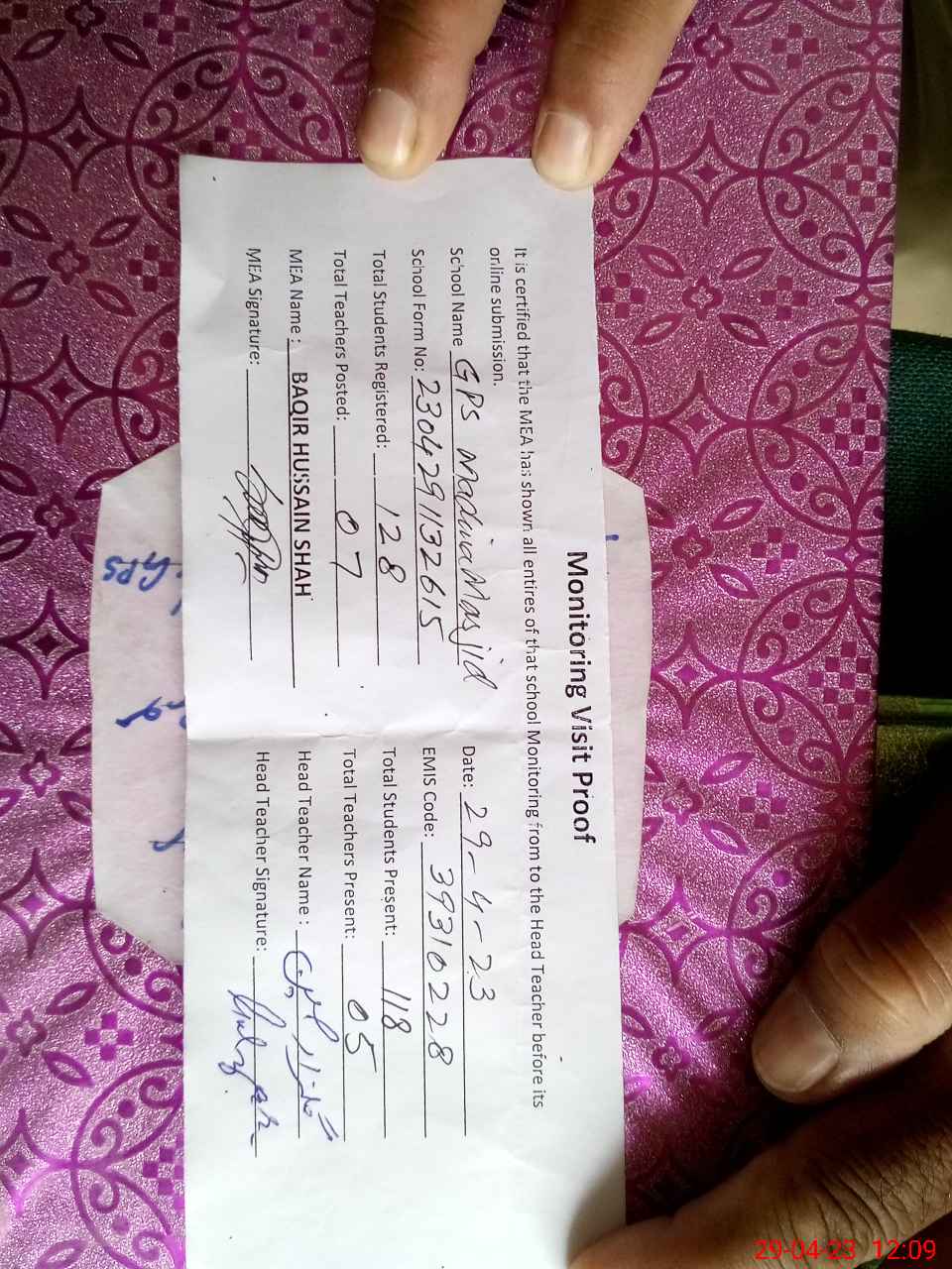 | Attendance Register | Head Teacher | MEA with School | Visit Proof |