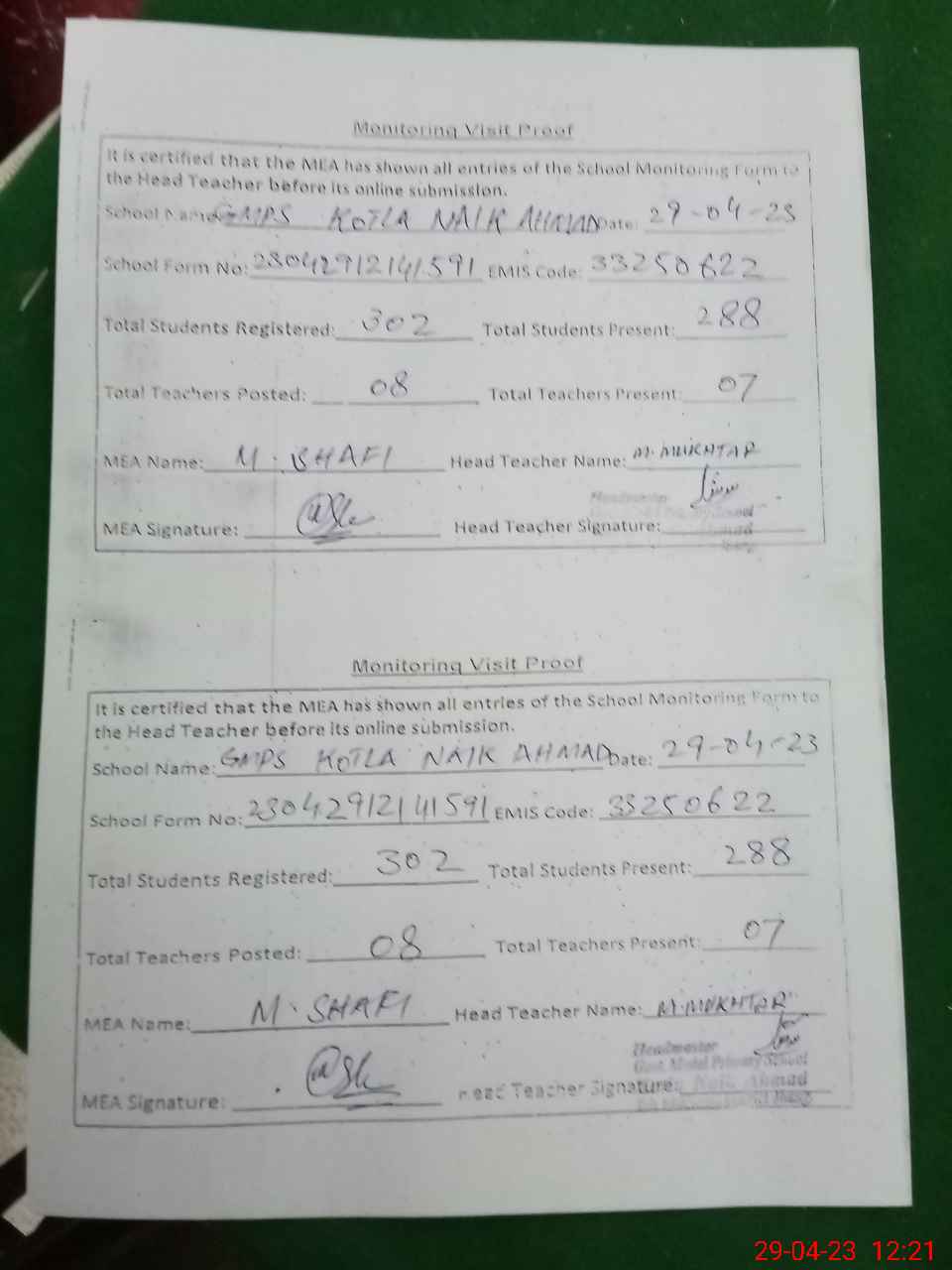 | Attendance Register | Head Teacher | MEA with School | Visit Proof |