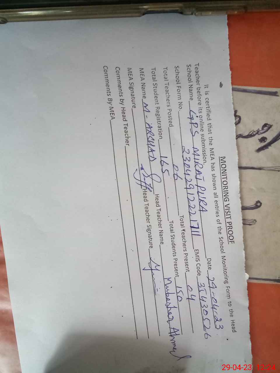 | Attendance Register | Head Teacher | MEA with School | Visit Proof |