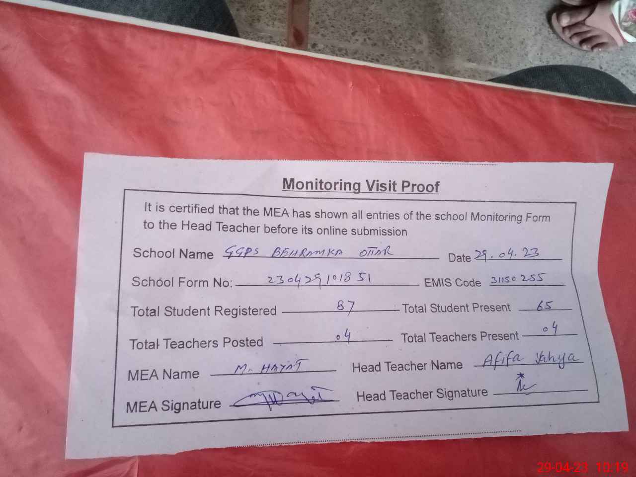 | Attendance Register | Head Teacher | MEA with School | Visit Proof |
