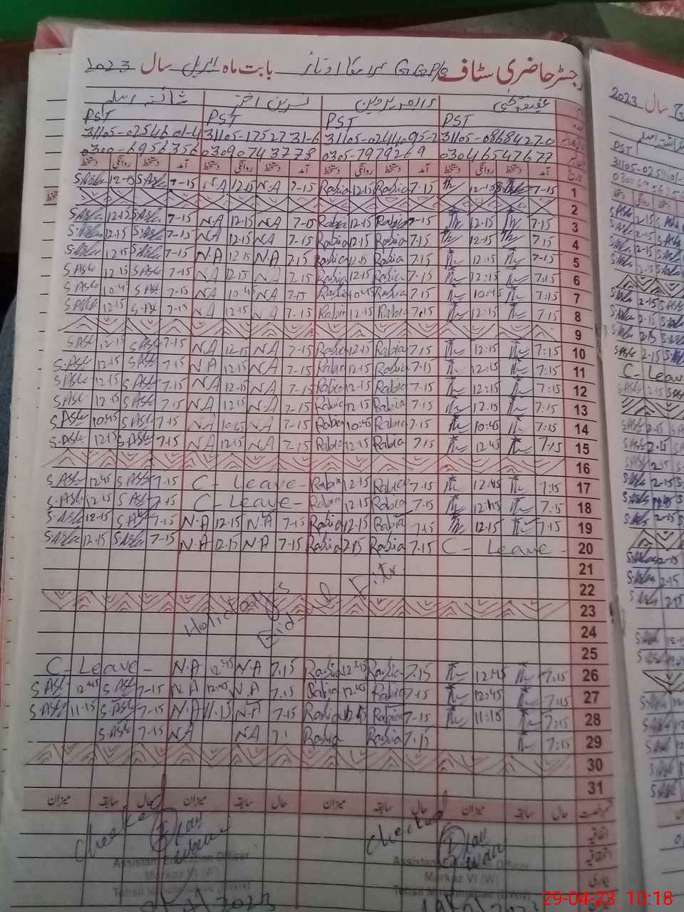 | CNIC | Full Name | Designation | R/C | Absence During Last Calender Month |