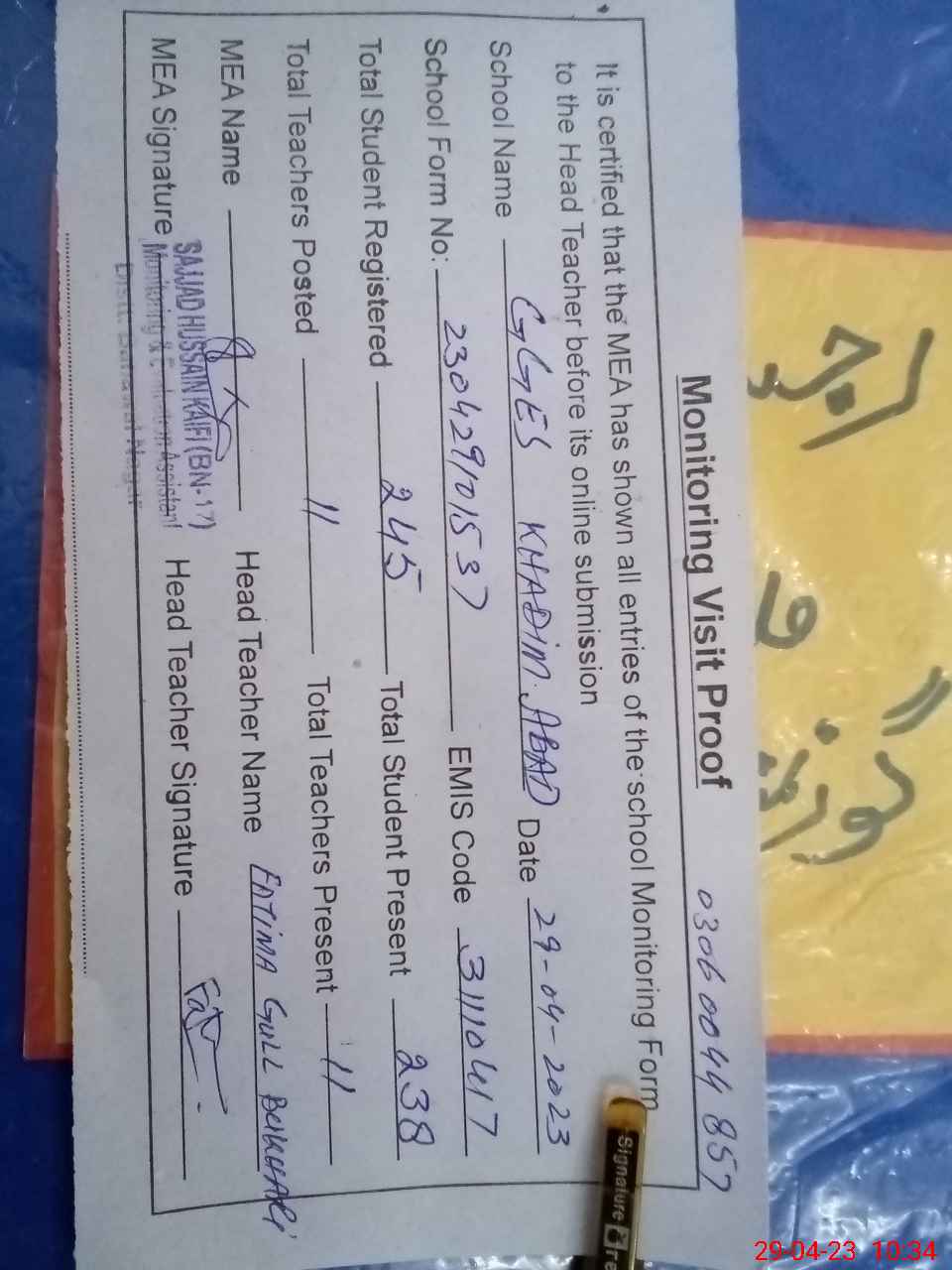 | Attendance Register | Head Teacher | MEA with School | Visit Proof |